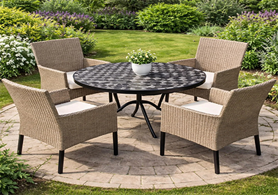 This outdoor table set features a stylish round table with a dark, patterned surface and a sturdy metal frame, making it ideal for outdoor dining.
